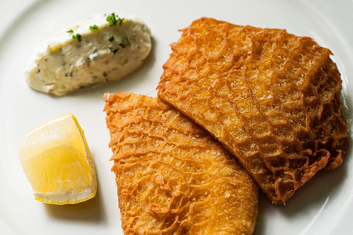 「Tablier de Sapeur」為里昂傳統菜色,意指「工兵圍裙」,這是每一家 Bouchon 小館不可或缺的經典菜式,也是最能體現里昂菜豪邁濃郁風格的代表性菜餚。「BeApe」採傳統作法要將大塊的蜂巢牛肚浸泡於白葡萄酒、杜松子等香料中醃漬,然後以小火燉煮並迅速撈起冰鎮,確保牛肚保持滑軟口感。最後,將牛肚裹上薄粉油炸至外皮金黃,香脆外皮卻又保持著軟嫩的質感,每一口咀嚼都有著白酒的香氣。