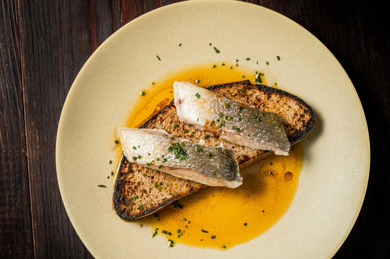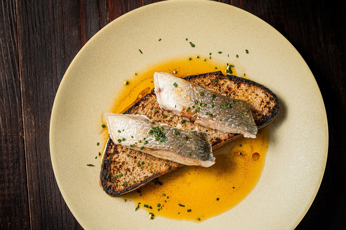Chef Eriane 以歐洲小酒館常見的開胃下酒菜為靈感;取自地中海沿岸傳統的油漬作法,將新鮮野生午魚,與橄欖油、百里香、大蒜等香料,一起低溫油封。經過長時間油漬的午魚,不僅香草香氣滲入魚肉中,鮮味也大大地提升,接著再燃燒櫻花木,透過煙燻方式,賦予午魚一層煙燻氣息。整道料理,以香烤酸麵包鋪底,搭配自製煙燻紅椒油,最後淋上夏多內白酒醋。整體香酸明亮,油潤鮮嫩。