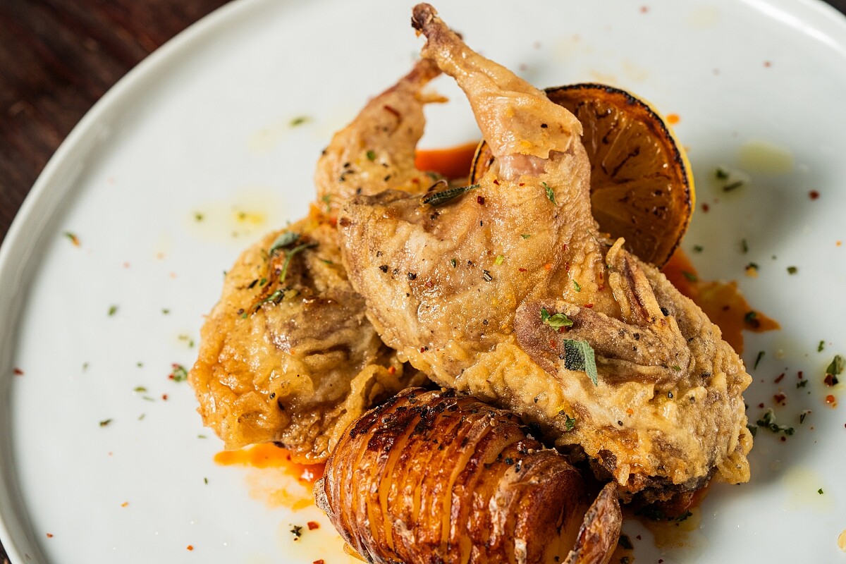 將整隻鵪鶉沾上一層薄粉,接著進油鍋中炸至全身金黃酥脆,一旁有煎得香脆的黃檸檬和內部鬆軟的現炸風琴馬鈴薯,配以鵪鶉、雞骨和雪利酒等悠久熬煮的濃醬。鵪鶉肉嫩滑可口,帶有一絲野性的肉香,成為當代巴黎 Bistro 最受歡迎的菜品之一!