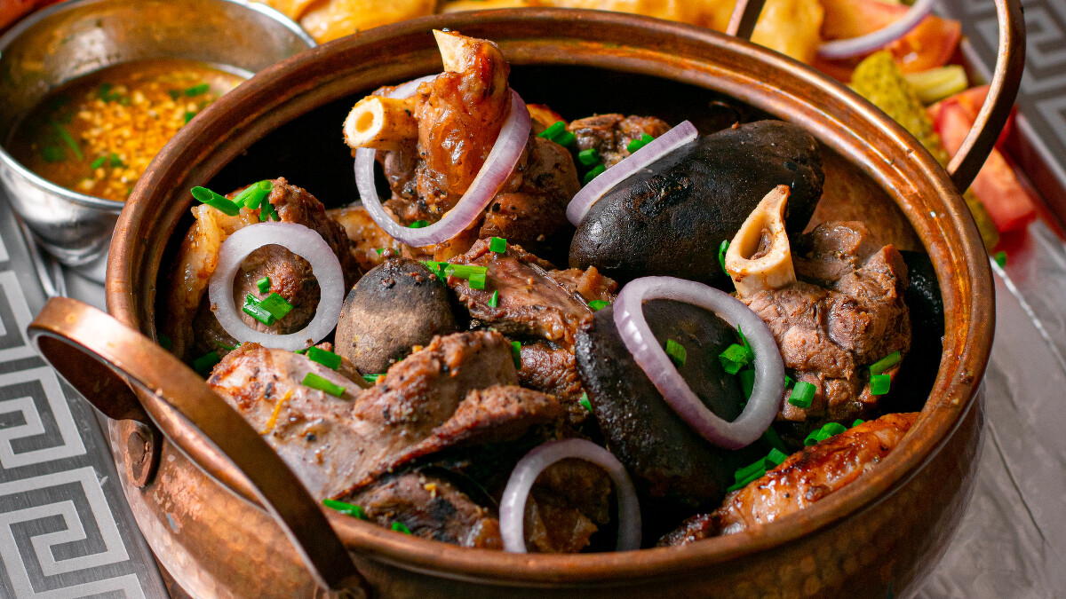 採用類似「水煮」的方式,將肉塊和蔬菜放入密封容器中,加入燙熱的石頭後用直火加熱,利用壓力鎖住肉汁的獨特風味,飪秘訣在於用奶桶「燜」和用鵝卵石「烤」,雖然烹煮過程相當耗時,是在台灣餐廳少見的料理之一。