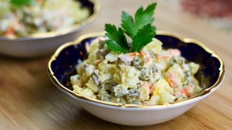這道簡單美味的沙拉,是蒙古經典家常必備下飯美食,每個家庭都有自己的獨特配方。主廚的做法是趁馬鈴薯熱騰騰時,用大湯匙或搗泥器將其壓鬆散,然後加入切丁的雞蛋、醃黃瓜和豌豆,再用美乃滋調味拌勻,開胃又爽口。