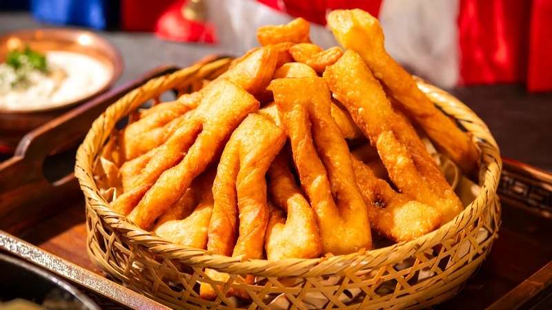 這道金黃色厚片糕點,外酥內嫩,將麵粉、牛奶、酸奶、奶油、雞蛋和糖等原料均勻攪拌後,揉捏成麵團,將純羊油倒入鍋中,以中小火加熱並慢慢油炸至金黃酥脆,再配上一杯濃郁的奶茶,酥酥脆脆又甜甜的口感,是蒙古人氣必吃早餐糕點。