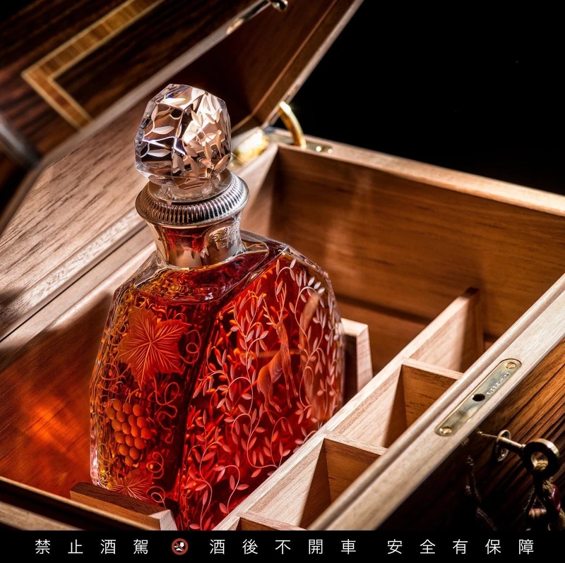 法國巴卡拉 (Baccarat)水晶酒樽結合純銀製瓶頸,純手工雕刻的酒樽圖案,搭配巴黎手工品牌艾迪布爾(Elie Bleu)精心打造的雪茄木盒,讓這款干邑擁有著與眾不同的氣勢,蜜棗、丁香花苞和無花果乾的香氣更是讓人難以忘懷。