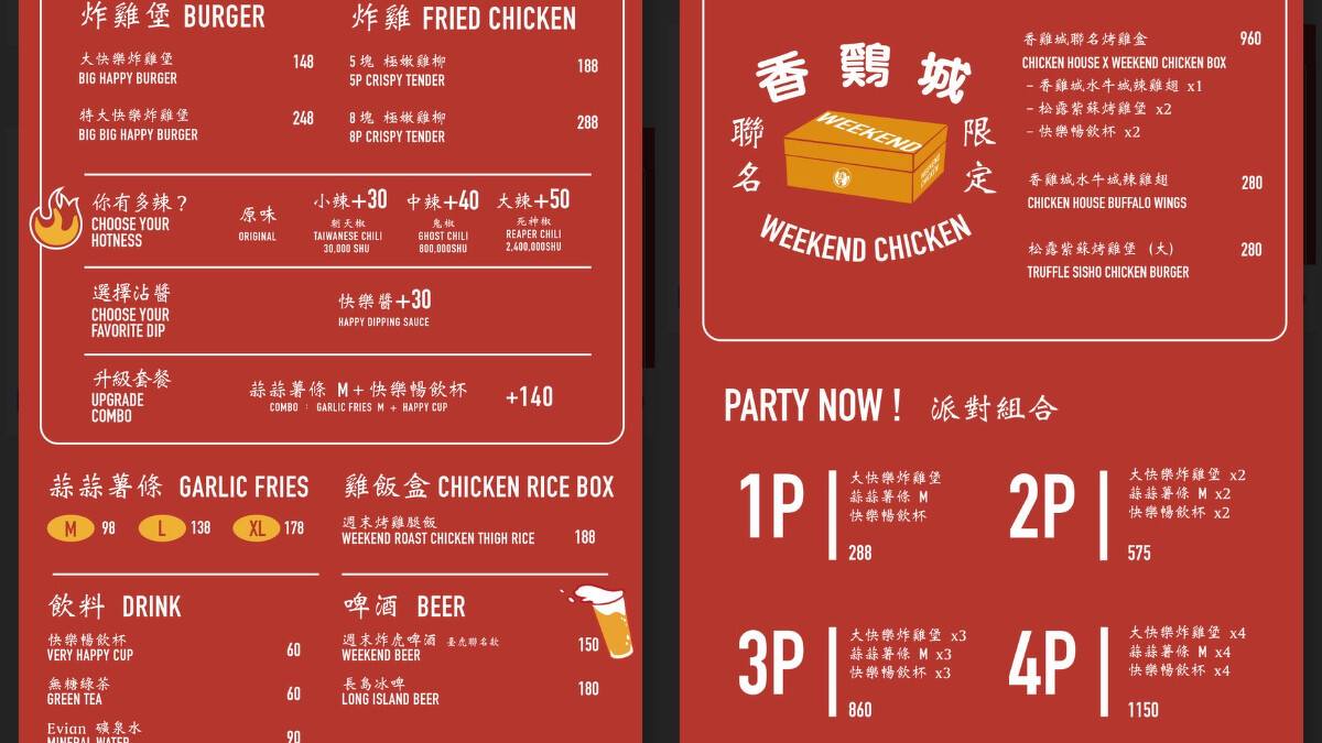 超人氣炸雞店「週末炸雞漢堡俱樂部」登陸台北大巨蛋,以美式速食快餐&台式小吃為風格靈感,除了有好吃的台辣炸雞和薯條外,還有讓人垂涎欲滴的美式漢堡。除此之外,週末炸雞漢堡俱樂部更和香雞城聯名,推出限定烤雞盒,「水牛城辣雞翅」油炸後裹上特調醬汁,外觀濕潤香氣十足、「松露紫蘇烤雞堡」則是同步回歸。
