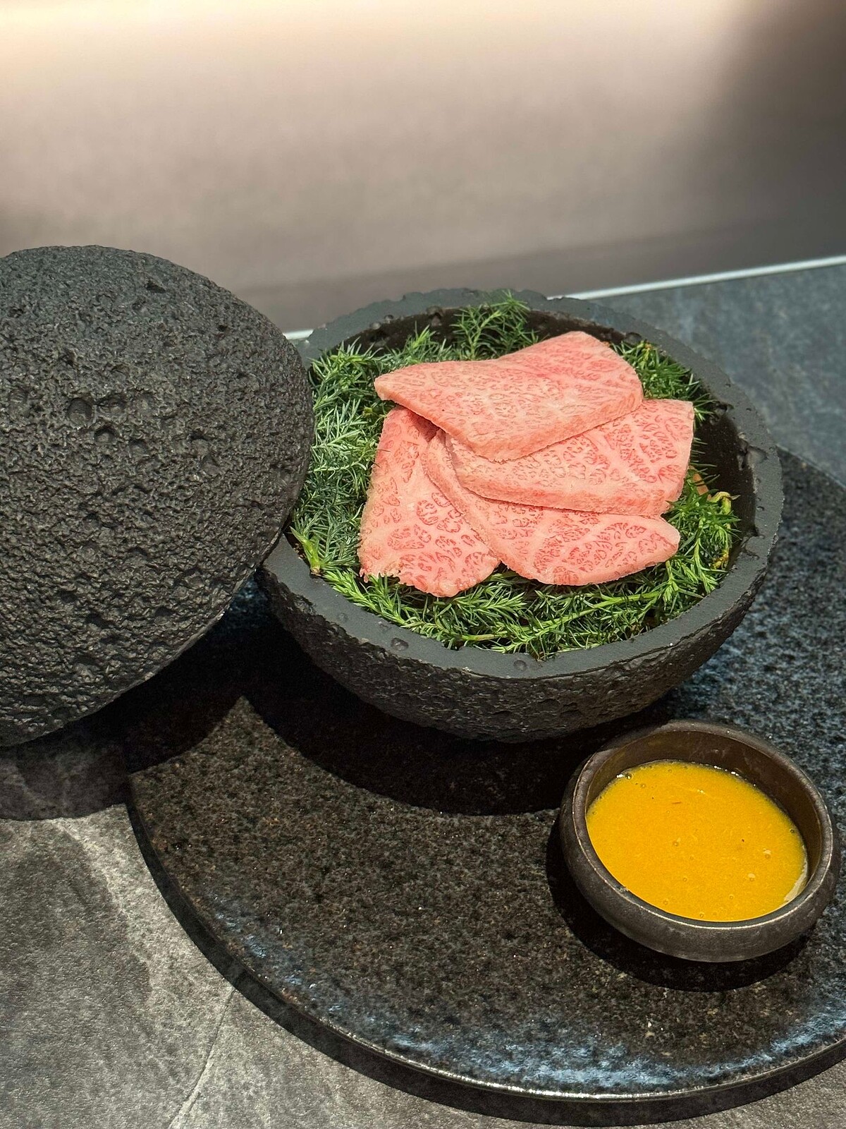 光外型就相當吸睛,將和牛霜降薄片盛裝在宛如星球的球形容器,搭配由柑橘和其他秘製成分調製的醬料,軟嫩肉質配上柑橘清香,肯定要試一下。
