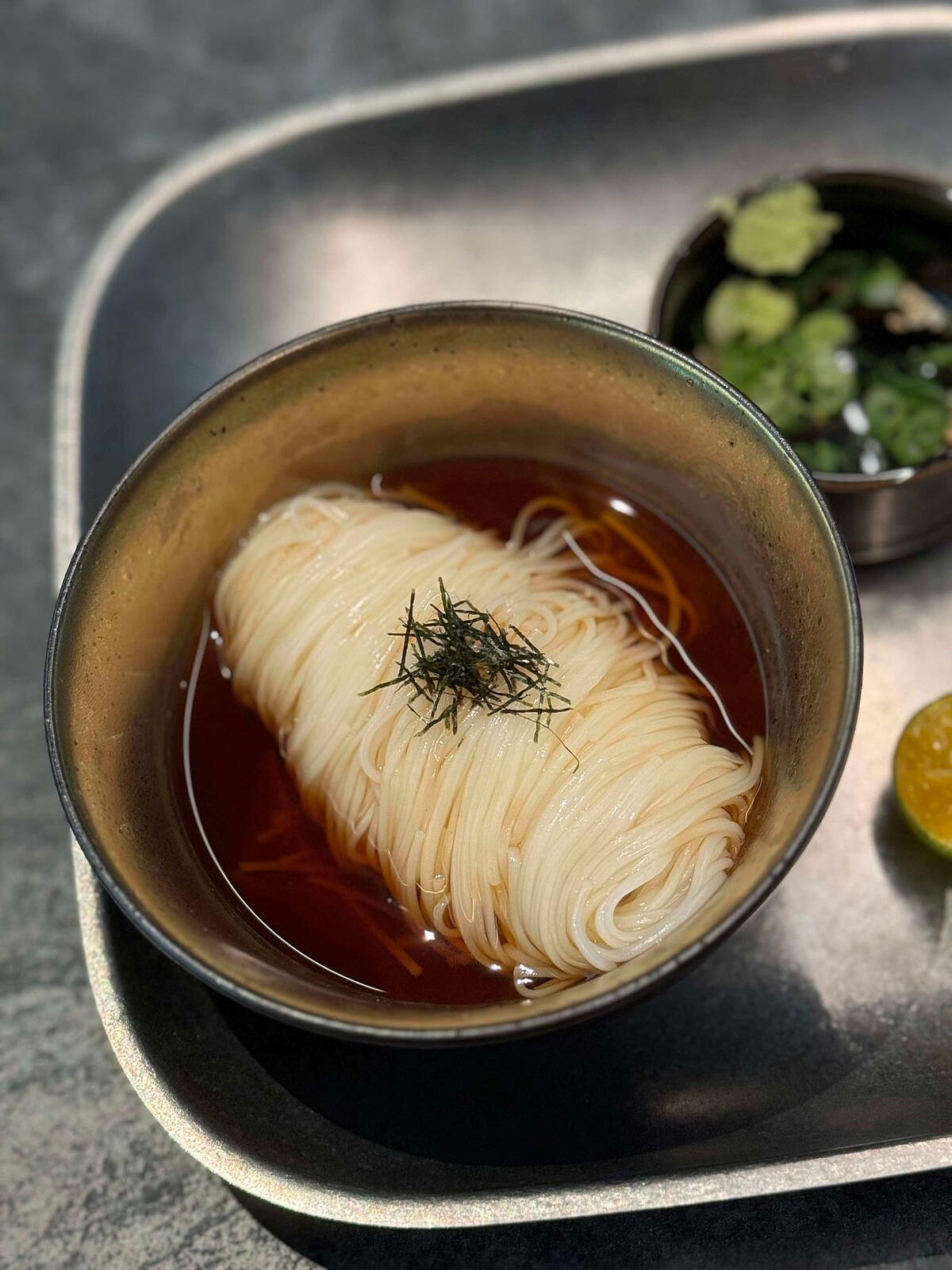 這次特別將福岡的手延素麵入菜單,特製的麵味露和柑橘清香的酸味突顯素麵滑順的口感,加入白芝麻、蔥花與芥末點綴,是嗑肉後的清爽之選。