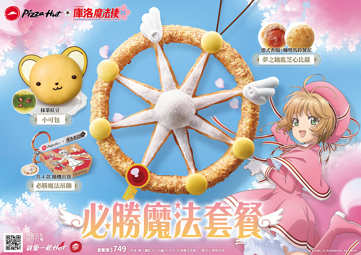 此外,必勝客還將經典角色神還原成「小可包」,選用純手工打造的蓬鬆麵團,內餡則是濃郁香醇的和風抹茶紅豆餡,購買「必勝魔法套餐」還附贈只送不賣的「必勝魔法吊飾」,超可愛的迷你比薩盒設計讓你隨身攜帶小櫻、小可與知世等人氣角色,共有四款隨機贈送。