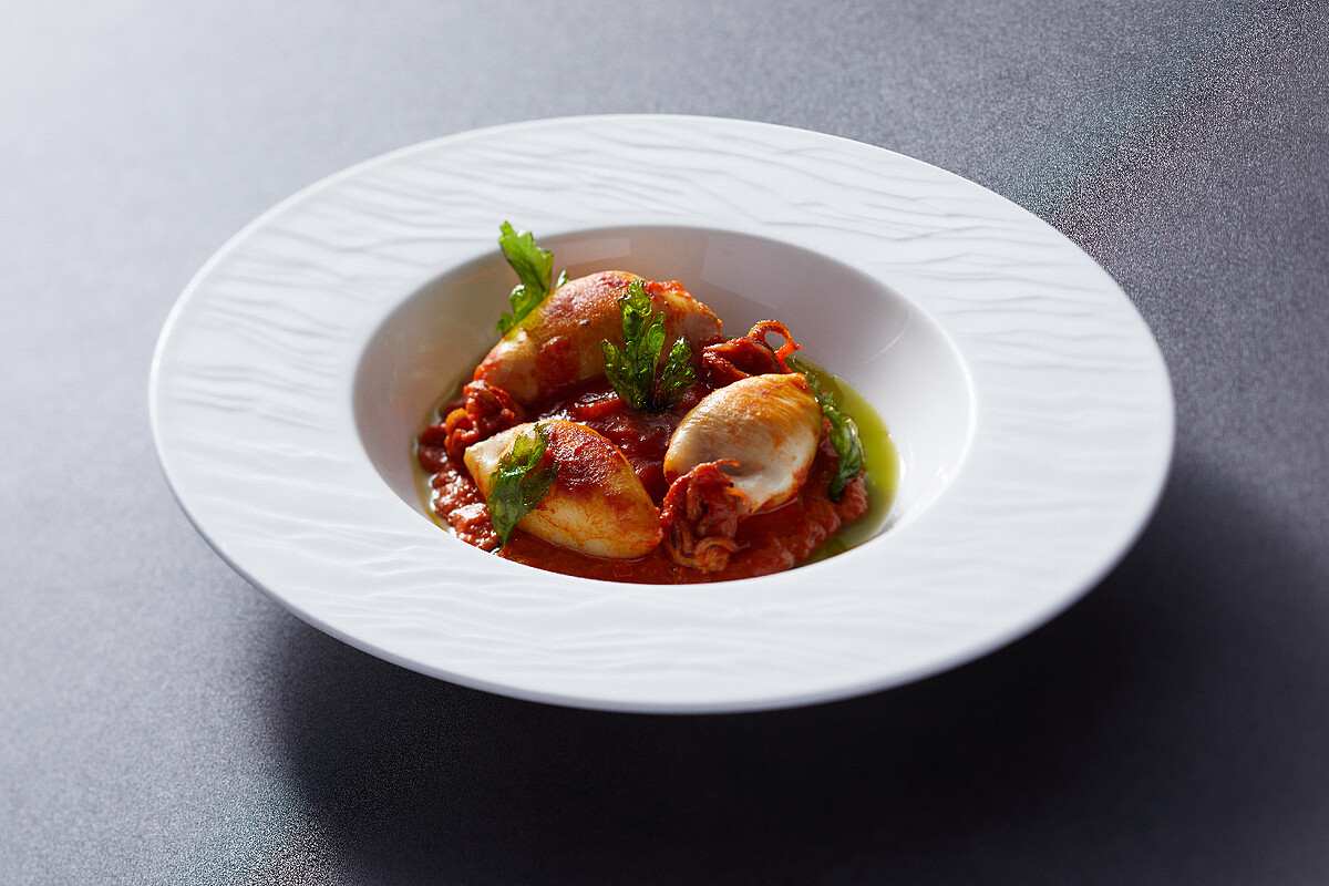 幾世紀前頻繁的移民文化,為法國帶入了異國文化料理的特色,當時移民至法國塞特港的義大利人,運用漁港當地盛產的魷魚製作義大利菜。如今選用含油脂量較多的梅花豬絞肉,塞入小卷內,煎至雙面黃金交脆,搭配番紅花與番茄醬料的傳統醬汁,以及源自於地中海西北區的大蒜蛋黃醬(aioli)。魷魚彈牙外皮與油質豐厚的豬肉餡的質感交錯,是一個將海洋與陸地風味充分交融的絕佳料理。