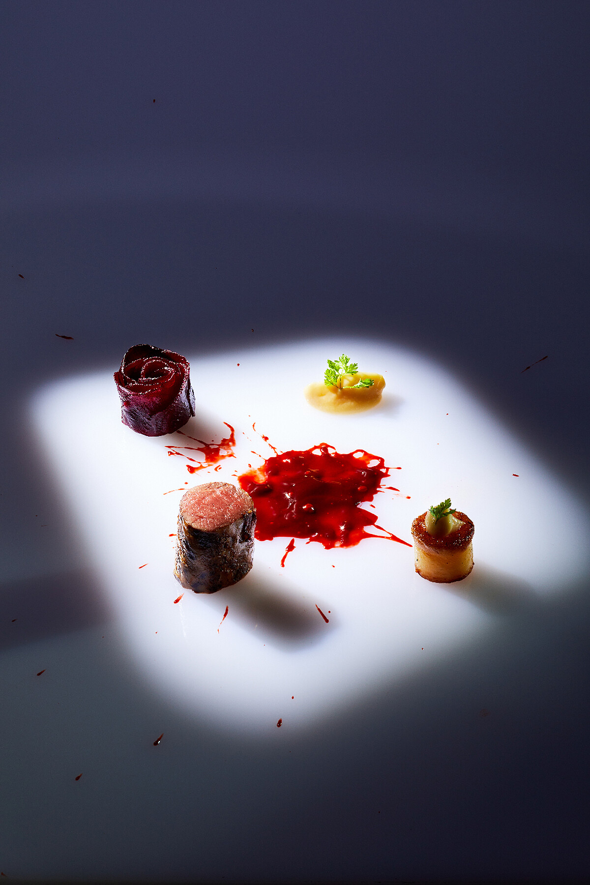 野味是歐洲貴族上的餐桌珍饈,在法餐中更被視為高級料理。換菜單必須保留至少一道野味,是巴賽麗廳 La Brasserie 的傳統。今年菜單中野味代表為紐西蘭鹿菲利,將菲力肉舒肥保持軟度與風味,包覆入豬網油煎至酥脆,在豬肉香的輔助下更添鹿肉香氣,出餐前碳烤至五分熟,配菜是法國家常的軟糖洋芋(fondant Photo),佐以甜菜根與覆盆子做成的醬汁,整道料理甜、酸兼備,口感層次豐富。