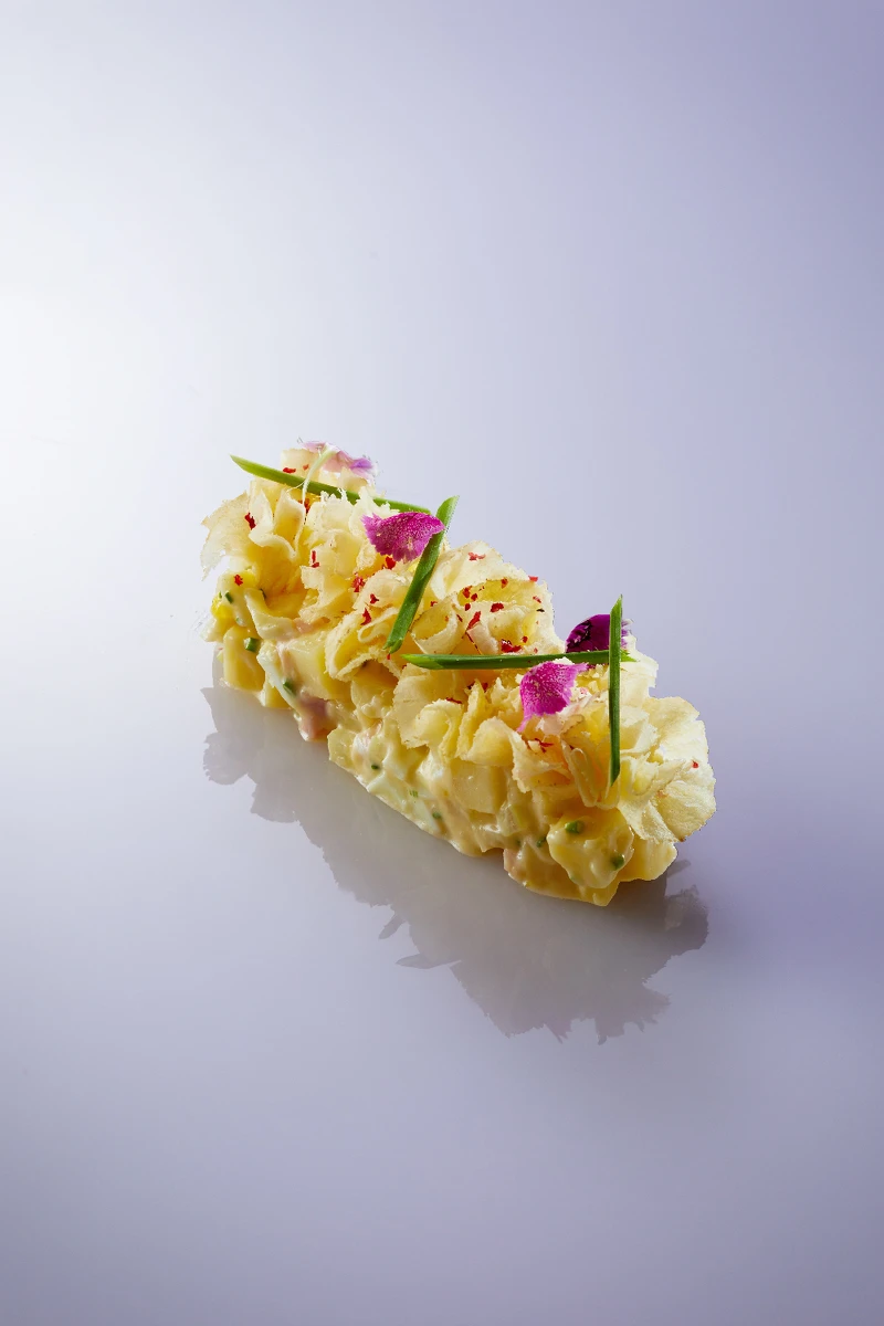 這道菜將馬鈴薯切成0.5公分的丁狀加入煙燻火腿丁、西芹、半熟蛋,最後與干蔥、美乃滋均勻混和朔形為長方體,舖以帶有果香熟成的僧侶頭起司削出如菌菇的極輕薄花朵狀,添入粉紅胡椒碎、蝦夷蔥,質地輕巧、氣味濃郁,非常美麗。
