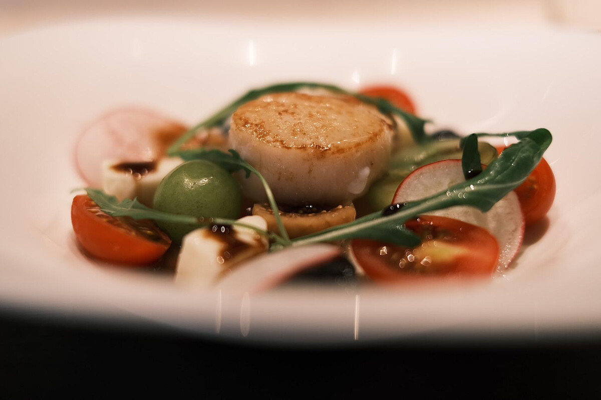 將新鮮的北海道干貝搭煎到外酥內嫩,再搭配番茄、莫瑞拉起司和無籽葡萄,最後倒上台灣高山水蜜桃醬和巴薩米克莓果醋,水果香氣讓干貝的誘人鮮味更上一層樓。