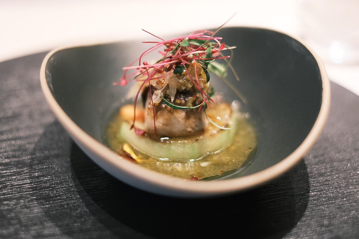 透過鐵板的高溫精準鎖定了野生鬼頭刀的鮮味,搭配柚子陳皮醬和小茴香、新鮮檸檬汁,讓魚肉除了肉質細膩Q彈外,略帶酸味的口感超級適合夏天。