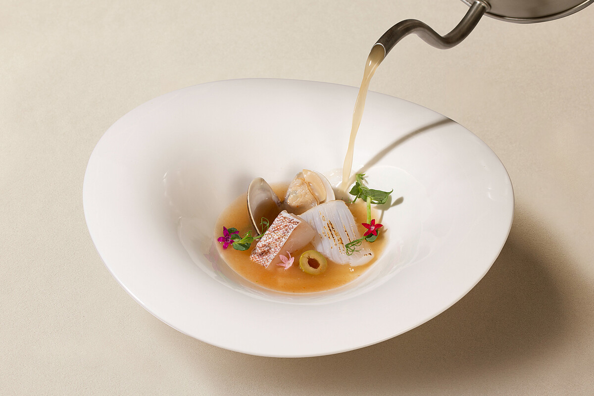 以西瓜綿、蛤蠣、番茄和鬼頭刀魚骨熬煮而成的湯底,除了能喝到海鮮的鮮味外,更能品嚐到西瓜綿的微酸。西瓜綿是將還沒有成熟的西瓜用鹽巴醃漬製成,是早期民間常見的食材。兩者完美融合呈現出的清新海鮮湯,能替饕客們打開食慾。
