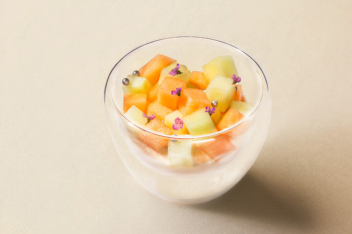 甜點控看過來!將台灣夏季盛產的哈密瓜以法式甜點技巧呈現,先是在熱呼呼的鐵板上淋上蘭姆酒,把炙燒香蕉至外酥內嫩,底層舖上哈密瓜雪酪,再搭配香草牛奶醬,甜而不膩的味道真的超級誘人。