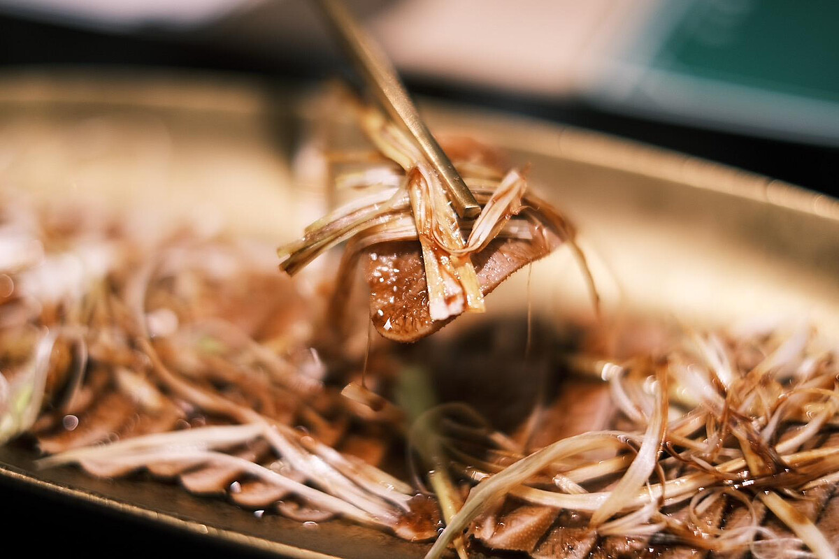 將牛舌中段浸泡於牛肉汁中一整夜,待牛舌完全吸收風味後取出薄切,確保每片牛舌均勻薄至0.1公分以營造爽口口感,可以搭配蔥白一起吃下肚,淋在上面的麻辣老抽醬增添微辛風味。