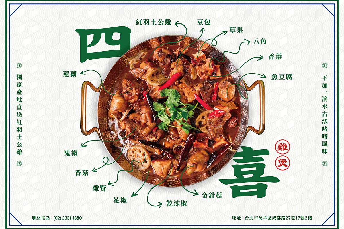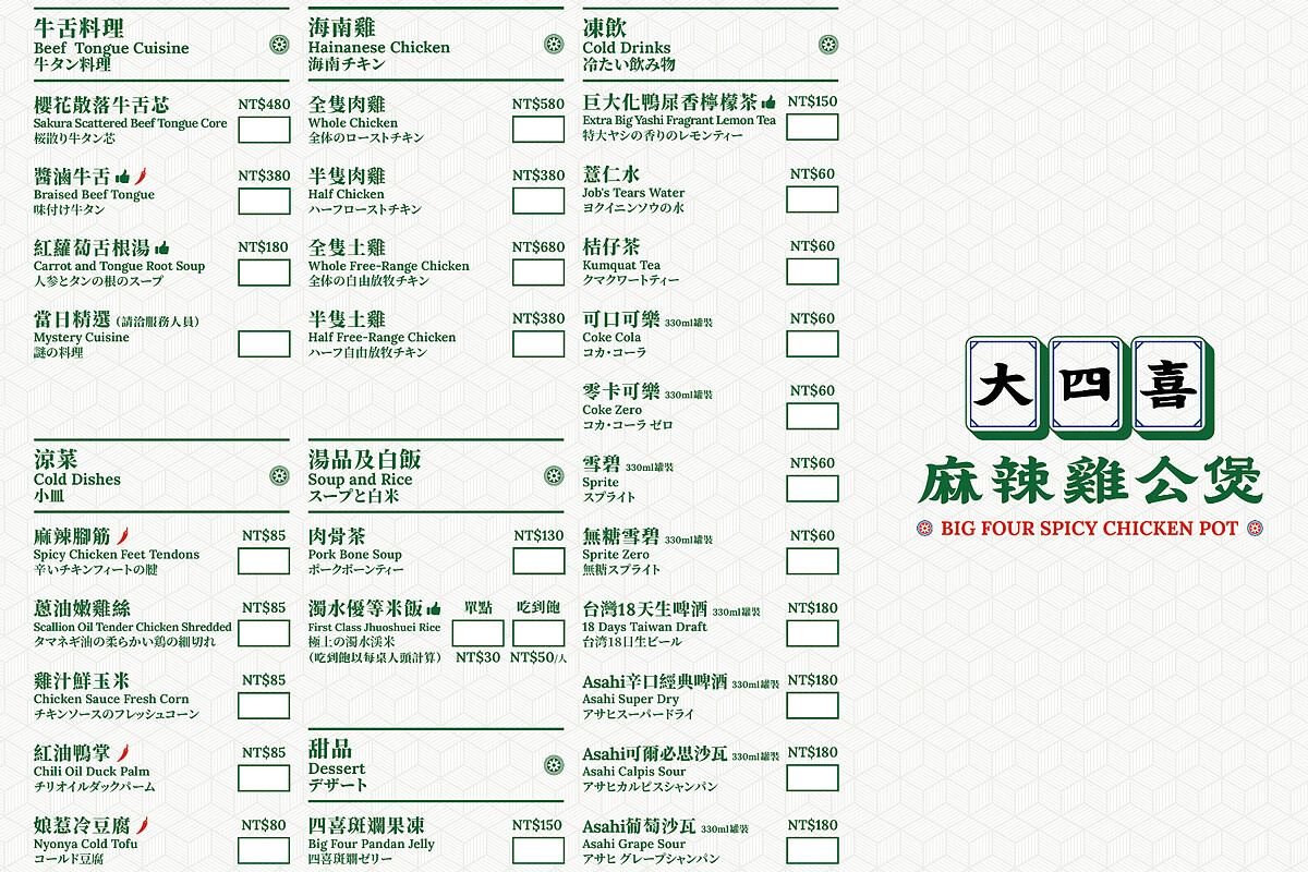 位於西門町的「大四喜麻辣雞公煲」主打要讓上門的饕客無辣不歡,堅持「嚴選產地直送的優質紅羽土公雞」、「經過六重獨特工序精心製作」、「精選八種高品質配料」、「使用融合18種香料的獨創宇宙最強辣汁進行猛火炒制」,雞公煲共有3種辣度可以選擇,除此之外還有Q彈美味的牛舌料理。