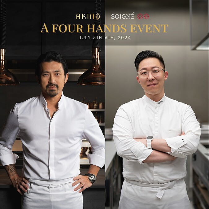「AKIN 君尹」則採日本無菜單料理 Omakase 概念與節奏,以簡約、直接、洗鍊的方式呈現乘載林明健主廚(Chef Kin)人生旅程與個性的料理。Chef Kin 選用當令優質食材,以法式料理技法為本,搭配港式與日式料理烹調手法,揉合香港家鄉味記憶、喜愛的日式純淨風味與南洋飽滿氣息。種種如此概念皆與 Chef Jun 透過料理展現韓國飲食文化有異曲同工之妙,此次兩位廚師在此次四手聯烹餐會上,將共同激發出動人的火花。