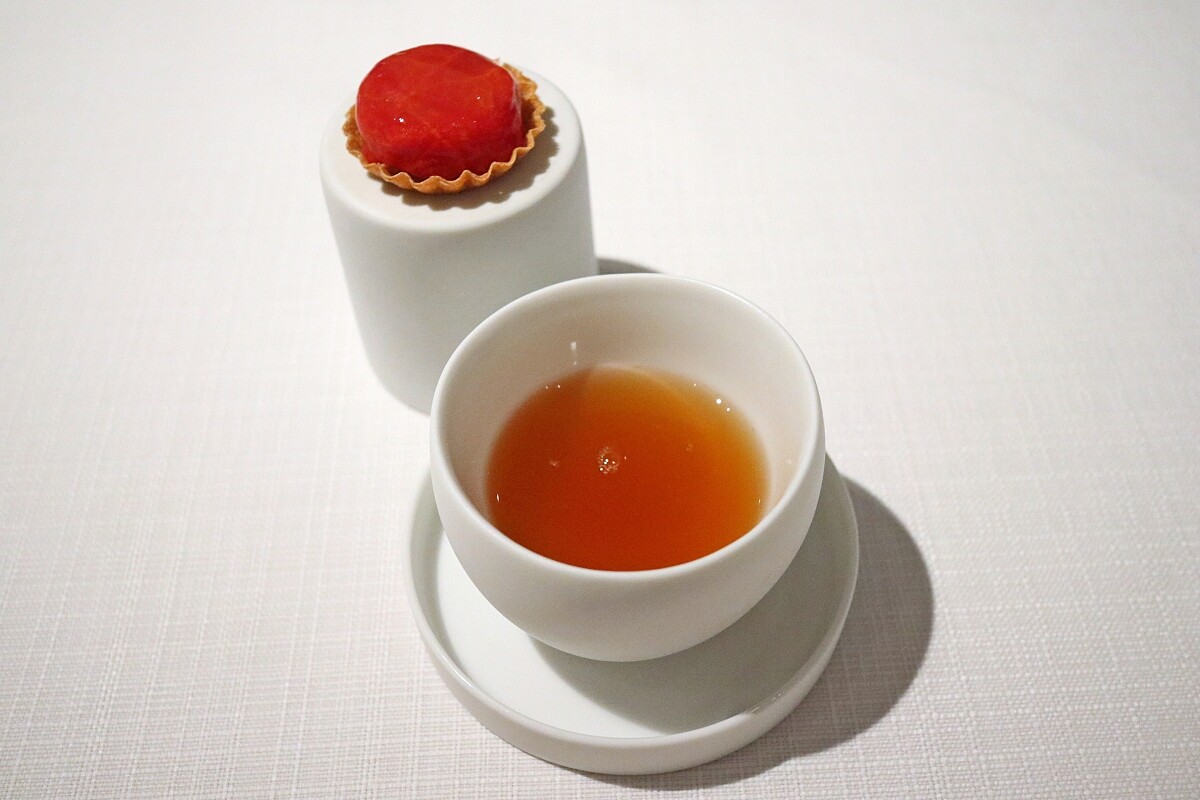 選用來自高雄仁武的牛番茄,去皮後稍作風乾,搭配茄子泥及鯷魚、小麥製成的薄脆塔皮承裝。一旁的冷茶湯則是將來自高雄美濃的玉女番茄打成泥後吊乾過濾出清湯,再以南投霧社的果木烏龍茶冷泡12個小時,深入探索以番茄的豐富層次,入口酸、甜、鹹、鮮交織,尾韻帶有茶湯的清新回甘,沁涼脾胃。