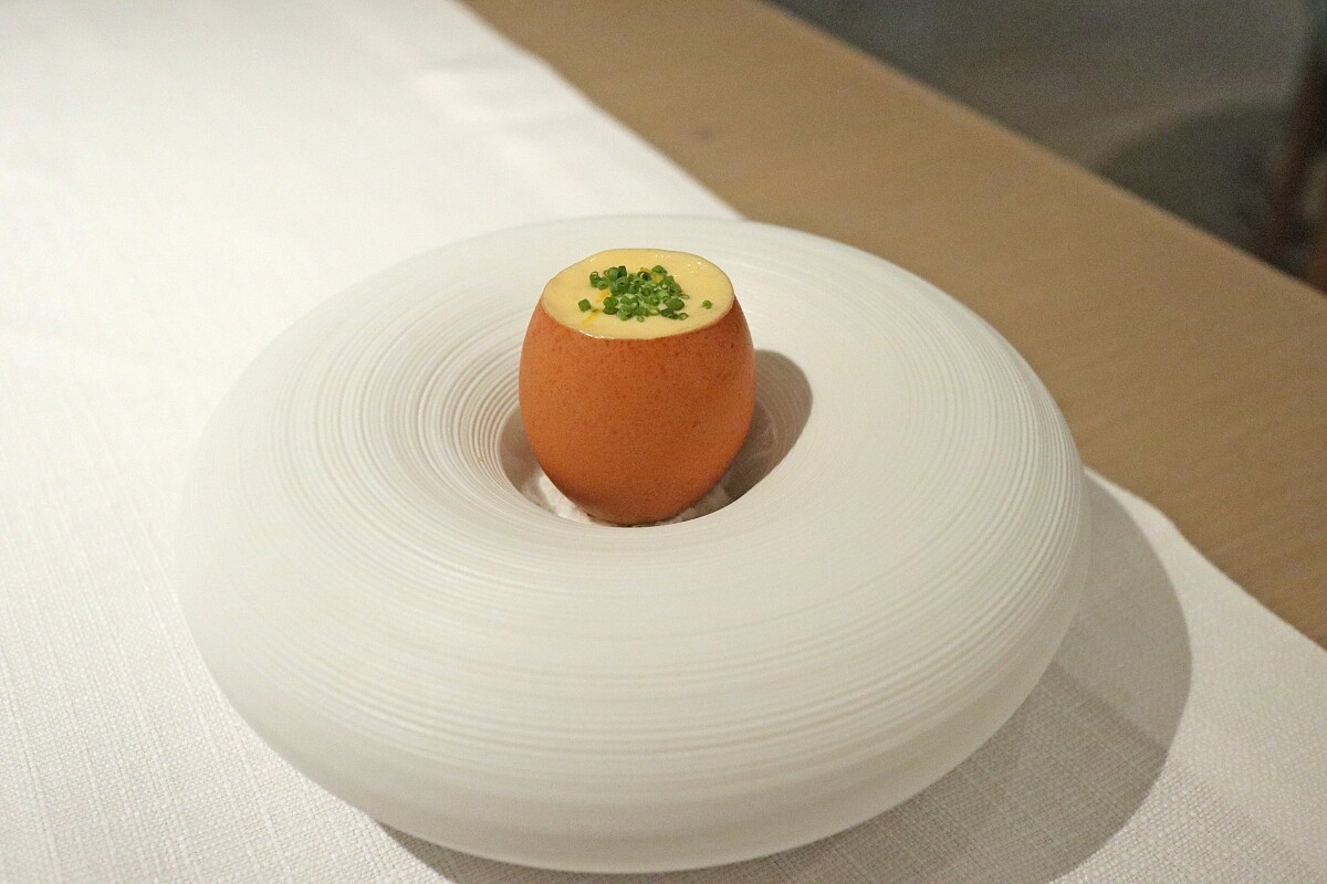 選用入口具有堅果與奶油香味的鱘魚子醬,底部鋪上當季綠蘆筍泥,再搭配台南永順興牧場雞蛋製成香氣馥郁的慕斯,藉此延伸魚子醬細膩悠長的風味。