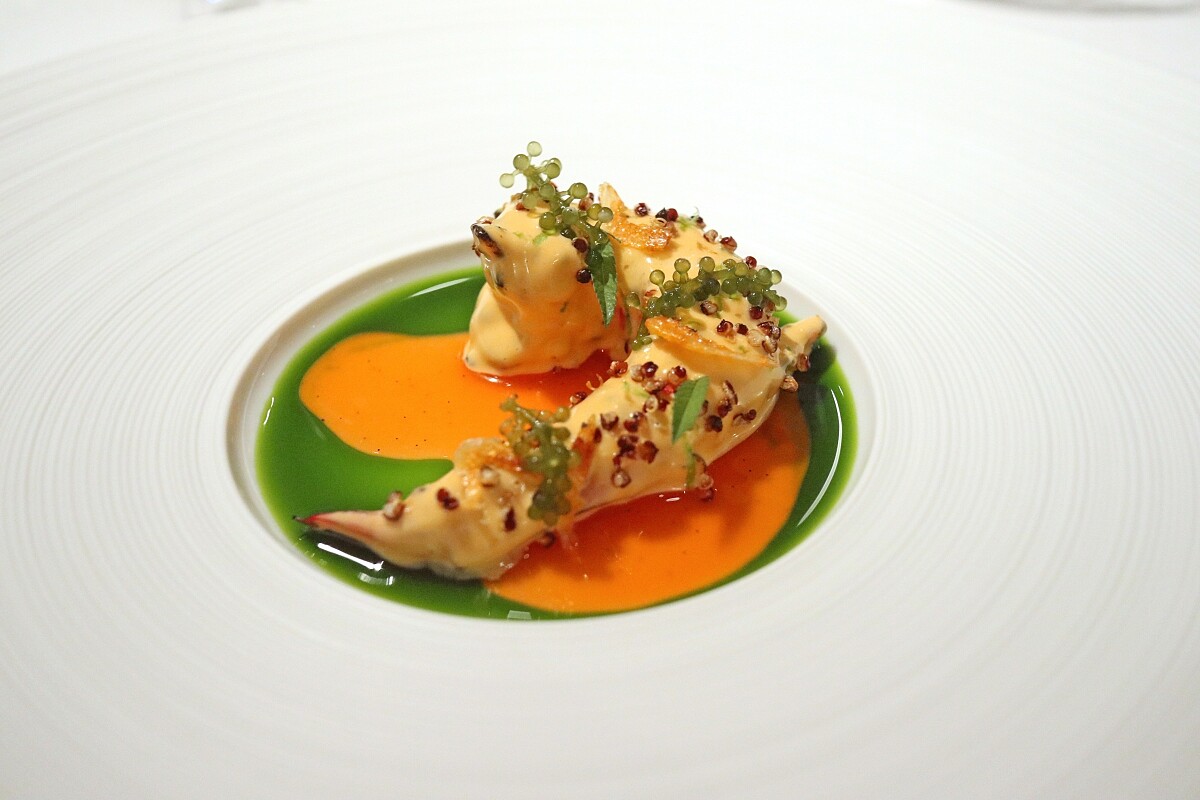 將東北角的胭脂蝦炙烤,再把蝦頭熬煮成蝦油,與蕃茄泥一同做成乳化醬汁,搭配酥炸過的藜麥、東港櫻花蝦、海葡萄以及芳香萬壽菊嫩葉,底部則以發酵甜椒及歐芹油做為醬汁鋪墊,帶點清新高雅的甘苦滋味,更襯胭脂蝦的馥郁鮮美。