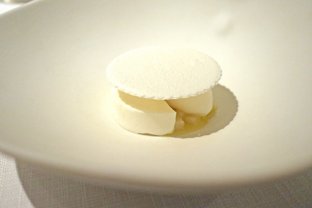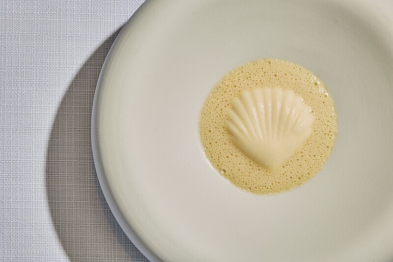 最能完整體現Nobu三大核心精神的料理為此道「帆立貝」,以單一食材干貝為中心,透過干貝慕斯、干貝奶油清湯等不同狀態交織,溫柔傳遞其始終如一的初衷與信念。