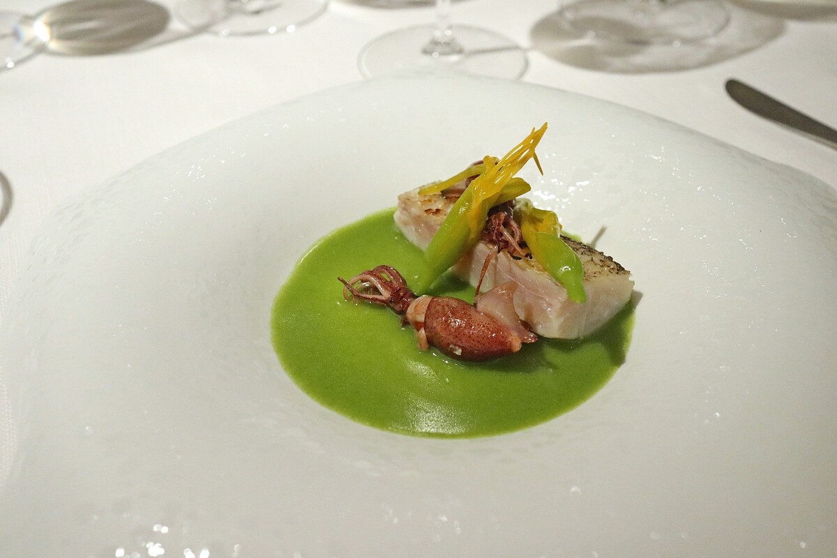 使用自南台灣海峽捕獲的「馬頭魚」,加入海鹽稍微淺漬後,再以備長炭直火炭烤,上方搭配來自日本富山縣、輕微炭烤過的瑩烏賊及當季所產的花蓮金針花,佐以丁香魚湯底、初榨橄欖油以及蒔蘿所製成的乳化醬汁,堆疊成亮麗飽滿的風味層次,入口後味蕾盡享來自海洋的柔和鮮美。