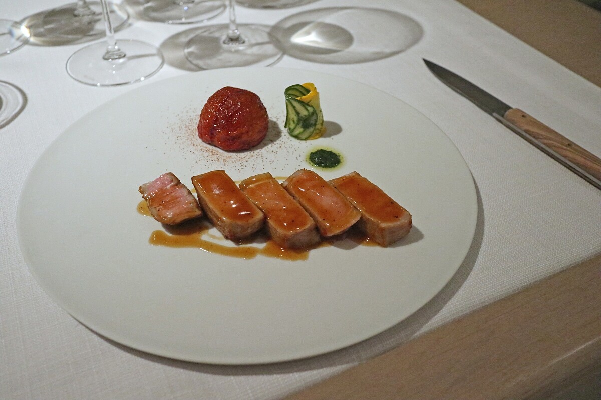 此次主餐有荷蘭「Niewerkerk 犢牛」與「f1日本國產牛沙朗」兩種選擇,Chef Nobu 認為天氣漸熱,選擇較瘦的牛肉部位,讓菜品風味豐富又清爽,也與高酸度的醬汁十分搭襯。「Niewerkerk 犢牛」的料理方式反映了「NOBUO」餐廳新派法國料理風格,「f1日本國產牛沙朗」則代表了 Chef Nobu 過去學習傳統法國菜經歷,使用 Béarnaise 醬(貝爾尼醬,一種經典的法式醬汁),通常有紅、白酒兩種版本,主廚選用了紅酒做以調味,加入乾蔥、胡椒、紅酒、香料與奶油,過程中必需不斷混入香料與奶油,濃縮其風味,醬汁帶有明亮的酸與草本香氣,是一款與歷史與風味皆具有厚度的濃郁醬汁。