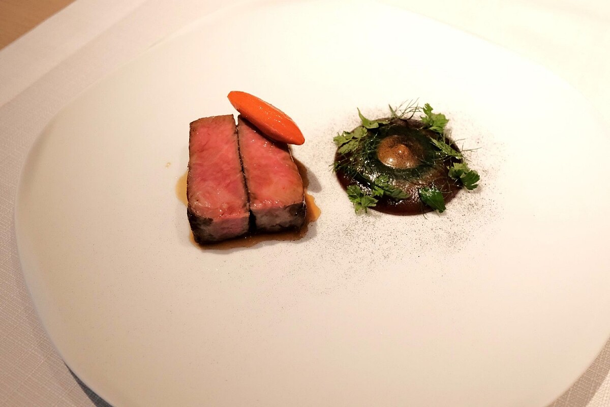 「f1日本國產牛沙朗」脂肪與肉質平衡度較高且風味清爽,採先煎再烤的方式烹調,搭配的醬汁以三道環形圈層呈現,從最內圈的蛋黃醬,到中層以四種香草呈現的青醬,至最外圈以焦化紅蔥、馬德拉酒、雪莉醋、雞汁反覆濃縮煨煮而成的貝西醬汁,最後點綴新鮮茵陳蒿、山蘿蔔、蒔蘿及歐芹,以層層遞進的強烈酸感、草本香氣以及醇厚風味平衡牛肉質的甜味,引導味蕾至更寬廣的境界,提供賓客依個人喜好加價選擇。