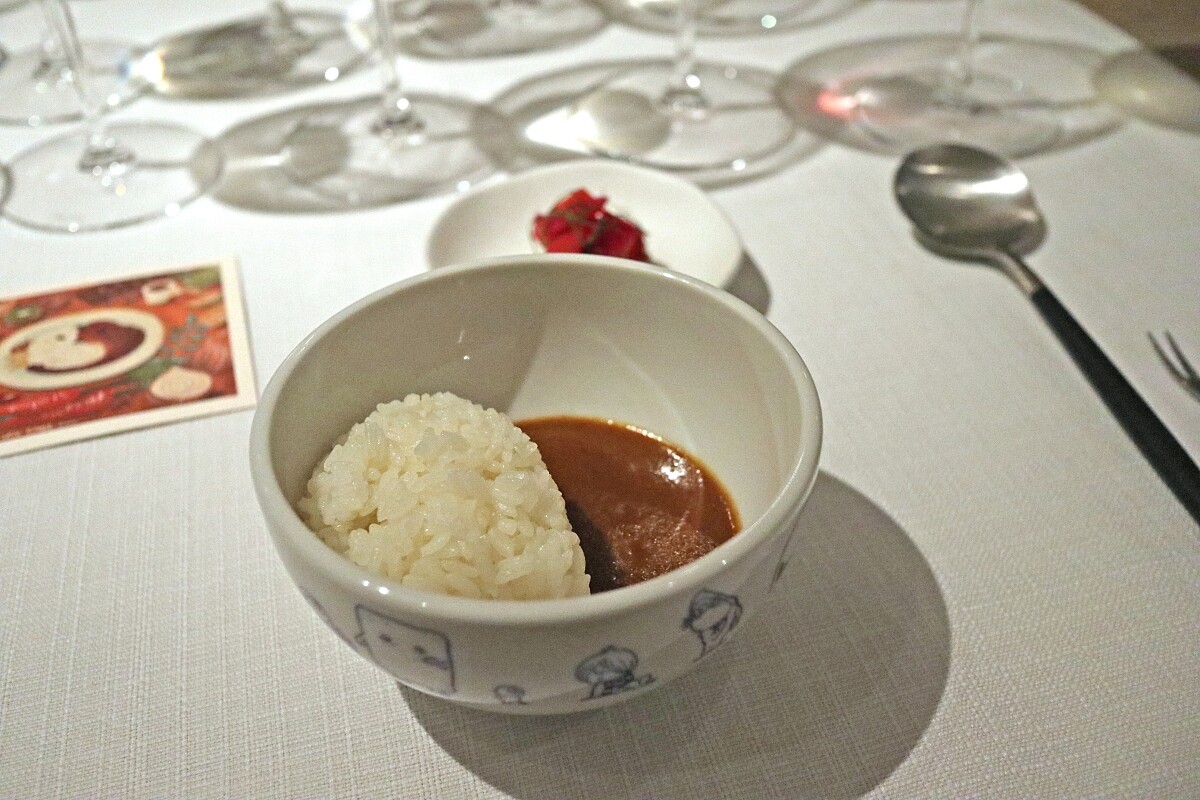 沒在菜單上的咖哩飯已成了「Nobuo」的傳統,在主菜後上場。食譜則來自已逝好友的配方,以蔬菜、蘋果、巧克力等等食材熬製,搭配上煮的恰到好處的台南16號米,一旁則有自製的福神漬,解膩之餘還能增添口感。