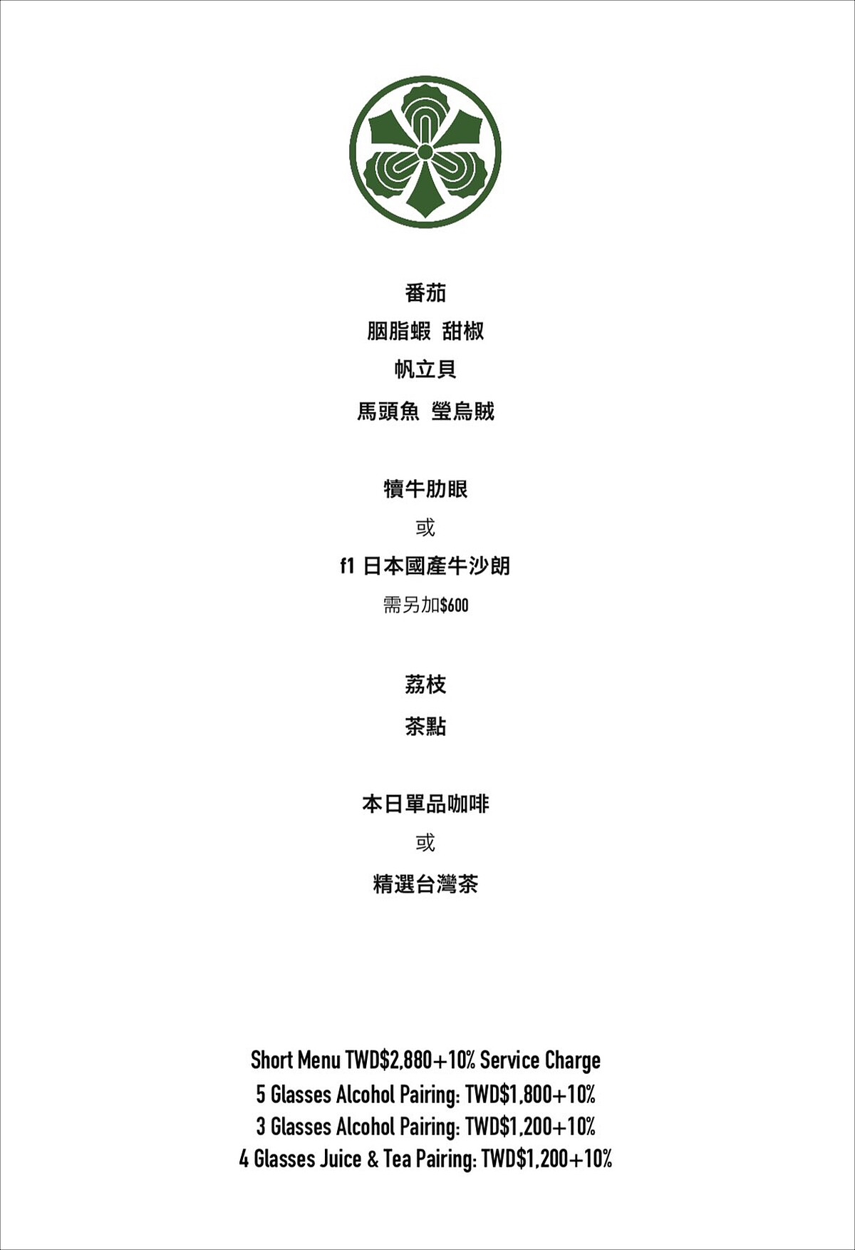 Pairing:可額外搭配5杯 Wine pairing NT1,800元、或是3杯 Wine pairing NT1,200元,亦有提供無酒精的 Juice tea pairing 4杯NT1,200元可供餐搭選擇。(套餐內容也會依照時令食材的供應狀態為主,不定期連動調整,餐費需另加一成服務費,付款方式可接受信用卡或現金付款)