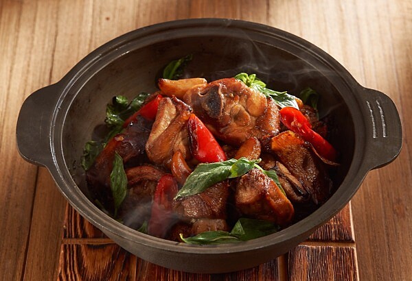 這是一道超級經典的台菜!以一杯米酒、一杯醬油、一杯黑麻油調和而成台式經典三杯醬,再配上蒜、薑、糖與炸香過的雞肉拌炒,起鍋前加入九層塔提鮮,鍋底醬汁散發著酒香、醬香與麻油香。