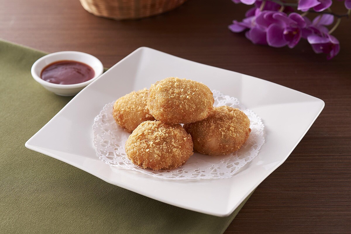 這道料理源自台菜酒家料理中的金錢蝦餅,有如金幣的模樣象徵吉利,不同於泰式蝦餅,台式做法是將蝦仁、荸薺、蔥花等食材剁碎,夾入豬背油中沾粉油炸,表皮金黃酥脆,搭配西式番茄醬,製作步驟繁瑣,想要吃的饕客記得事先預訂喔。