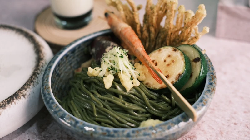 選用京都產宇治抹茶的麵條,口感滑順細緻還散發淡雅茶香,搭配酥脆炸蔬菜與大蝦天婦羅,讓人忍不住一口接著一口。(隨套餐附選)