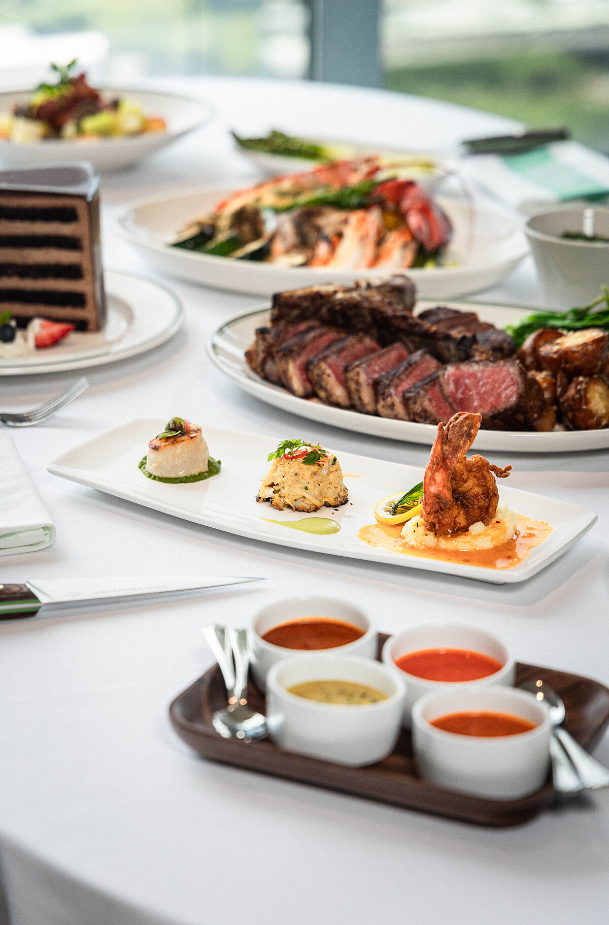 Smith & Wollensky將人氣3道前菜「憤怒蝦、蟹肉餅和香煎干貝」組合成拼盤,讓饕客可以一次享用到美味的海鮮料理。股神巴菲特必點的料理是「乾式熟成帶骨紐約客牛排」,濃郁肉香與帶勁口感是其特色,也深受美國人喜愛。是台灣人最愛的牛排則是油花豐富、肉質軟嫩的「乾式熟成帶骨肋眼牛排」。如果你是和一大群朋友一起造訪,或是想要點一道讓人眼睛為之一亮的料理,44OZ的「乾式熟成美國和牛戰斧牛排」就是你的首選,不但是以桌邊服務的方式呈現,還有火槍炙燒乾式熟成牛油的桌邊秀!飯後甜點則可以選擇「巨大巧克力蛋糕」,口感濕潤又甜而不膩,適合好朋友們一起品嚐。