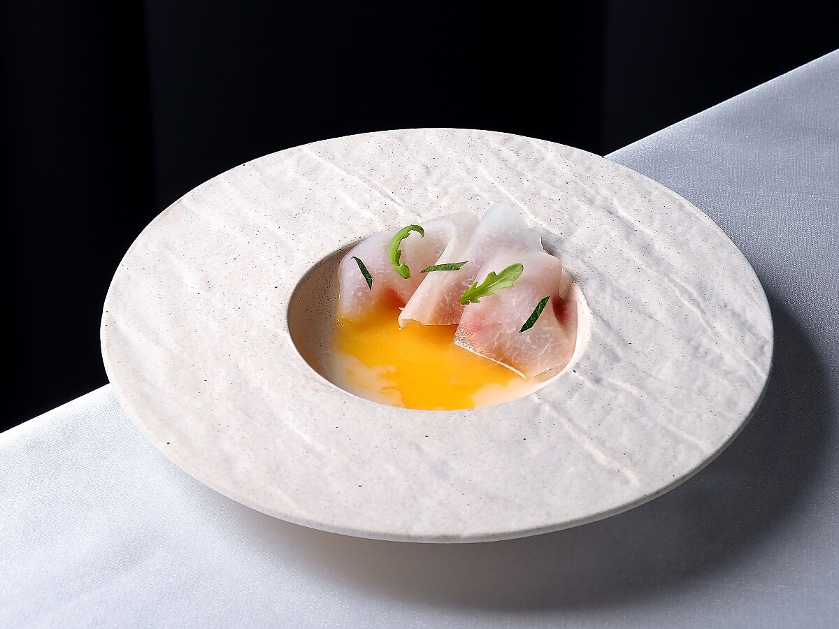 來自主廚由台南「漁光島」之旅得到的靈感,燈籠果的的醬汁猶如海岸線上的夕陽,而覆蓋在其中的豆薯片則展示了海浪的曲線。裡頭的黃膏甜蝦綴以檸檬馬鞭草的香氣,一旁還有以萬壽菊醃漬的蘆薈丁,入口盡是甘甜綿糯以及草本清香,並隱約帶著微酸,除了視覺感染力十足的菜色,也充滿風味細節。此外主廚善加利用調酒「油洗Fat Wash」技巧,萃取了椰奶的獨特風味,製作成的澄清醬汁,為整道料理增添了風味亮點。