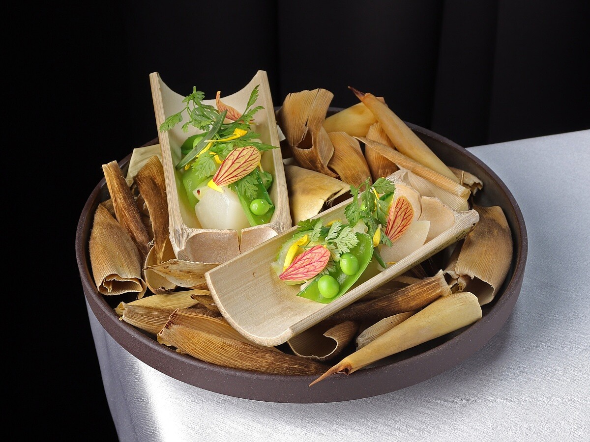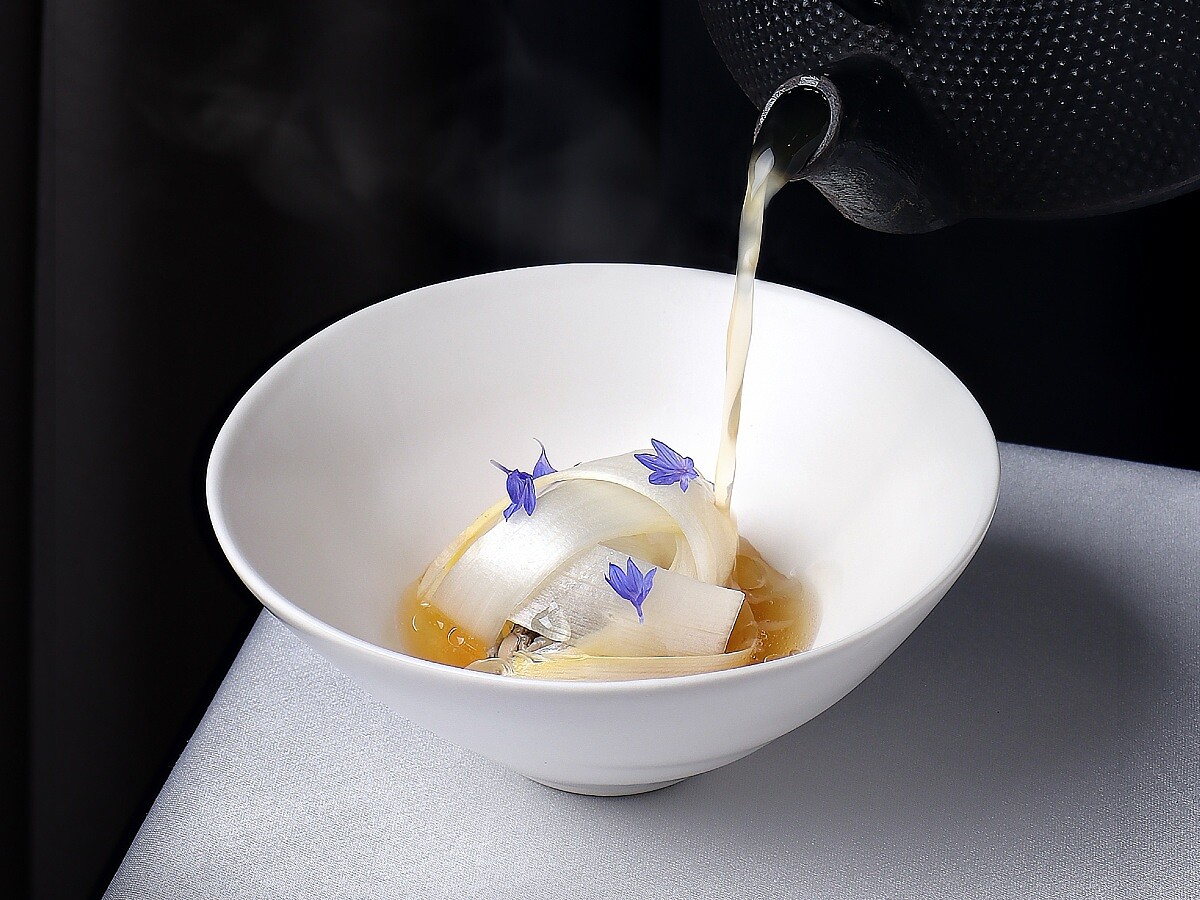 高雄有許多知名的古早味小吃,像是蒸蛋湯與鴨肉料理就是其中一種,主廚就以這些小吃為靈感創作這道湯品。以鴨湯為底,加入彈牙的春螺、當季白蘆筍、鴨胸火腿,最底層則是柴魚蒸蛋,呈現了多種不同的口感,清香回甘的湯品喝來舒心宜人。 另外可搭配一旁的墨魚泡芙,內餡有鳳尾草、魚腥草,帶有草本香氣的內餡,與湯的旨味十分搭襯。