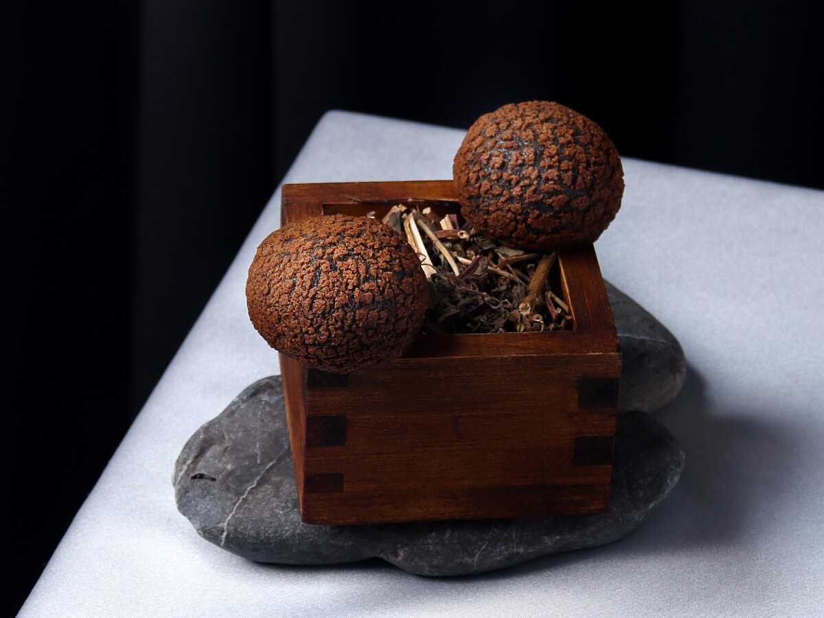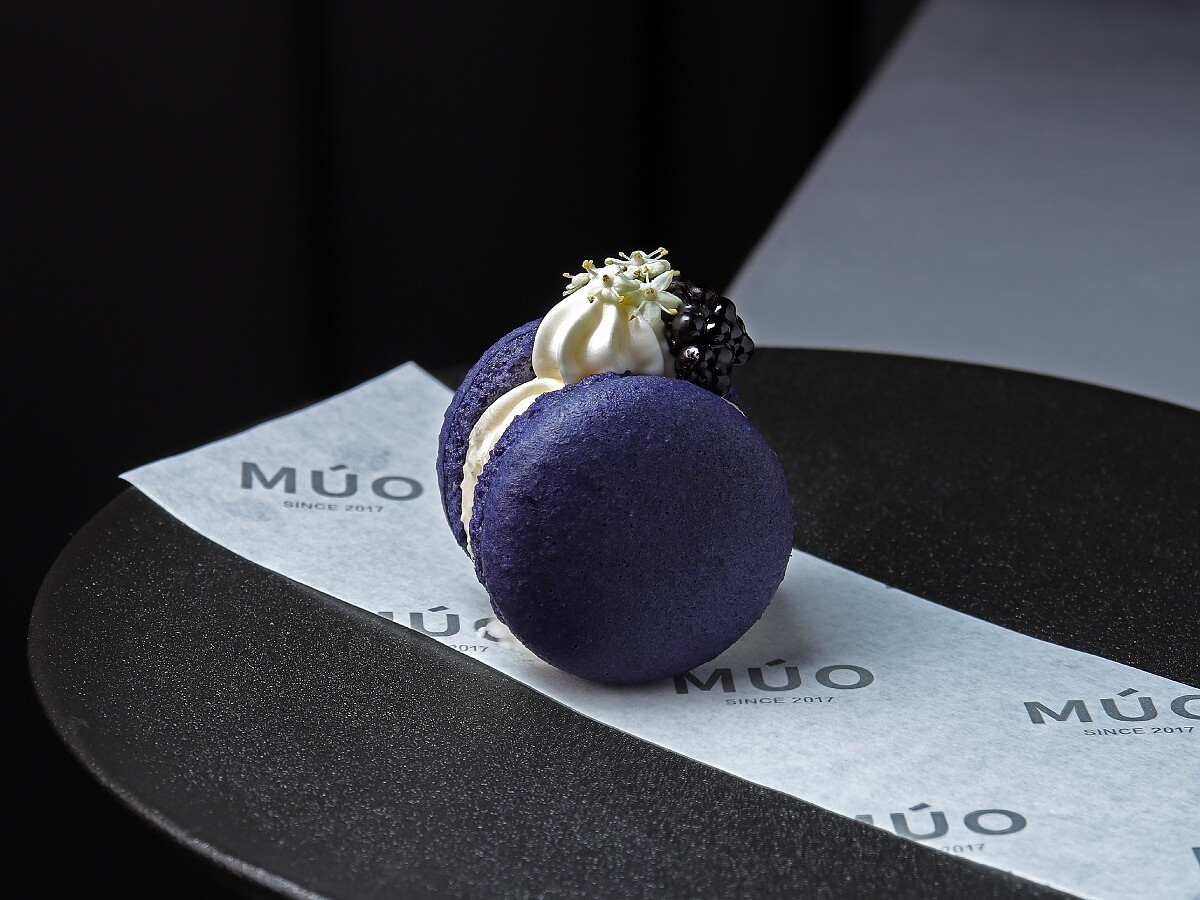 最後是黑醋栗、桑椹的風味組合製作而成馬卡龍,以香甜的果香作為完美的結尾,一旁則有苦蕎麥茶作為搭配。