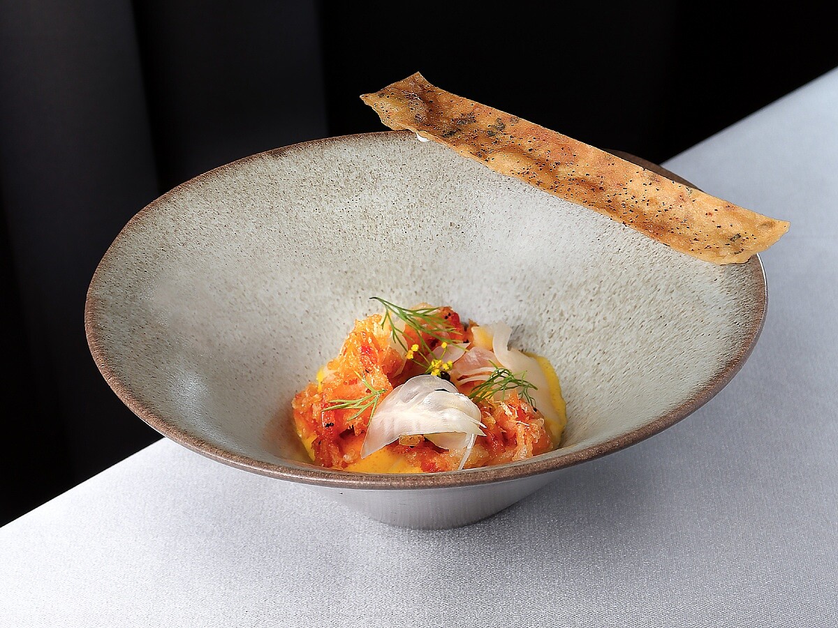 主廚透過這道料理引領我們來到他的屏東老家,選用東港新鮮的櫻花蝦酥炸成小餅,搭配上 絲綢乳酪與 Ricotta 起司製作而成的荷蘭醬,中心則有魚子醬、茴香作為搭配。在器皿上則放上一片以櫻花蝦粉、杜蘭小麥粉製作的脆餅,最後撒上「鹽膚木」。櫻花蝦濃郁的香氣與乳酪的酸做了美好平衡,脆餅沾附了醬汁能品嚐到淡淡的甘梅香氣,一道菜品有多種不一樣的吃法,增加了食趣。