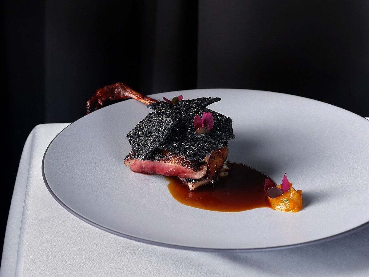 選用來自嘉義的鵪鶉,主廚以拿手的烤製手法展現功力,完美保留下細緻的肉質,而表面則沾染上迷人的火烤香氣。盤底有洋薏仁製作的燉飯,大膽的以豆腐乳作為調味,發酵的獨特香氣調製了鵪鶉的野味,一旁還有宜蘭金棗醬汁、藜麥脆餅,能作為轉換口味做以調整。