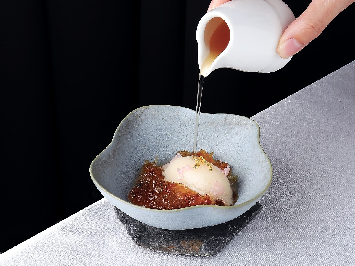 清口的前甜點選用青梅、水蜜桃、白木耳的風味堆疊而成,將茶液與櫻花結合做成果凍,中間則夾有白酒、蜂蜜煮過的水蜜桃,再包裹上以甘酒、梅子酒製成的 Sorbet,碗底則鋪上一層充滿童趣的跳跳糖,除了豐富了口感,也帶來感官的刺激。水蜜桃淡雅的果香與梅子交融,不但清爽也感受到一股涼意。