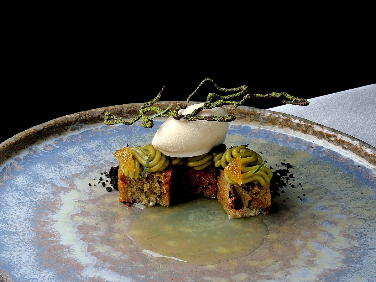 主甜點以春夏森林為靈感,將綠意搬上餐桌,甜點組合為櫻桃抹茶磅蛋糕、白豆沙開心果泥跟帶有清爽茶香的文山包種茶冰淇淋,將盤飾甜點的特色發揮得淋漓盡致,也充滿意境。