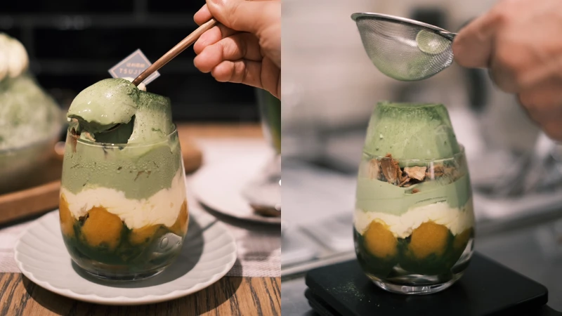 以水信玄餅、芒果雪酪、芒果奶蓋、抹茶霜淇淋、抹茶奶酪布丁、餅乾打造出的完美甜點,宛如一場在舌尖的派對,多樣配料層層堆疊,每一口都是不同的味道交織在一起。如果你是咀嚼控,一定會越吃越開心,吃完布丁後,繼續往下挖就能吃到酥酥脆脆的餅乾,越過雪酪、奶蓋後,水信玄餅更是超級Q彈!