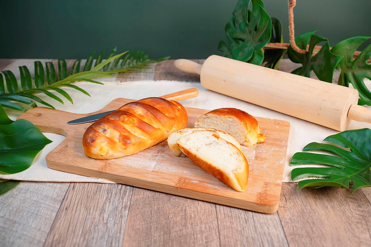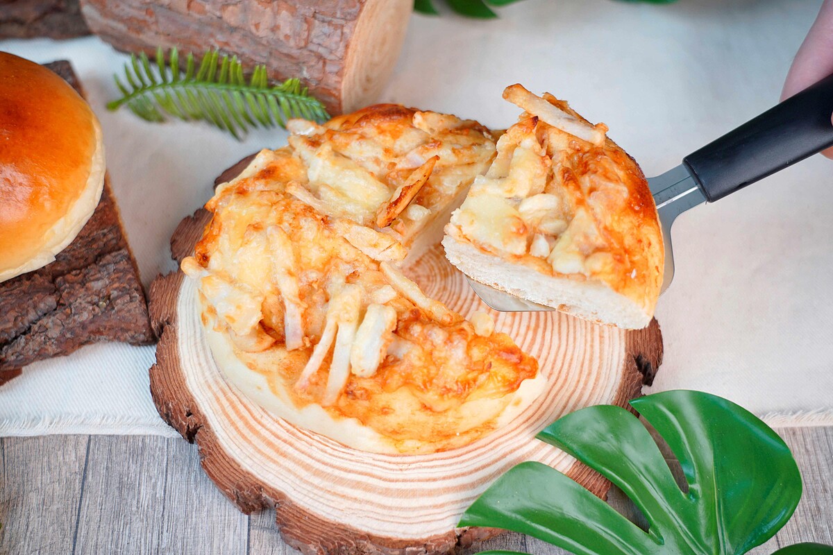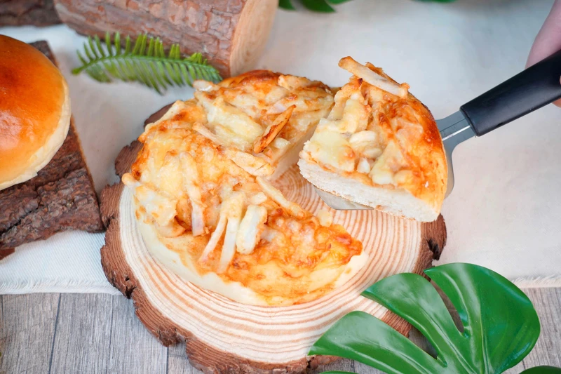 以西拉雅族的傳統美食為靈感,西拉雅芋切絲後炒製成餡料,鋪在以魯邦30%製成的軟法麵團上,做成披薩造型,口感軟綿易咀嚼、鹹香順口,99元。