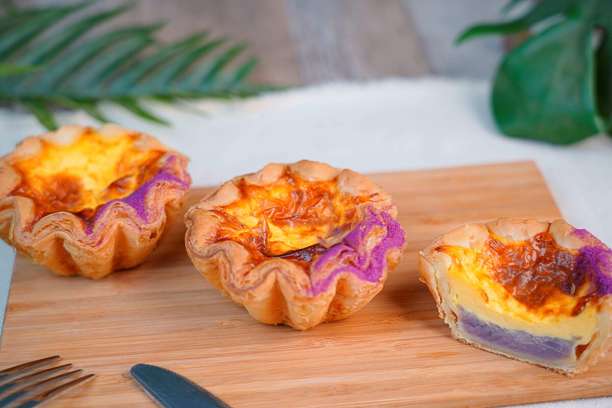 最近超夯的蛋塔也有芋頭口味啦!派皮以法國 T65麵粉製作而成,融入港式千層酥的概念,以法國鮮奶油和頂級視好蛋製作成布丁餡,搭配混入紫薯地瓜的檳榔心芋芋泥,外皮酥鬆、蛋香四溢,88元。