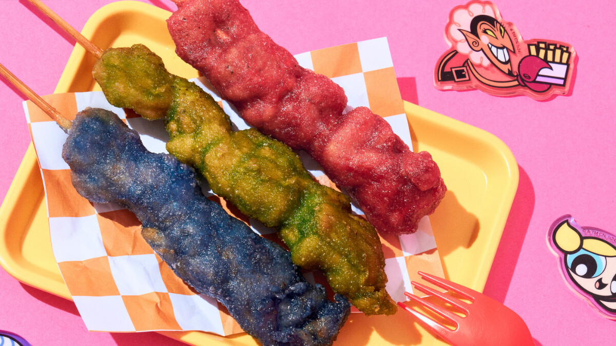 8/1登場的「馬卡龍雞肉串」與「雞排本色」共同合作無色素之天然粉漿,打造出三色馬卡龍雞肉串,紅色雞肉串採用紅麴風味,綠色雞肉串則是抹茶風味,藍色雞肉串則使用梔子花風味,香氣四溢讓人聞到就忍不住口水直流。