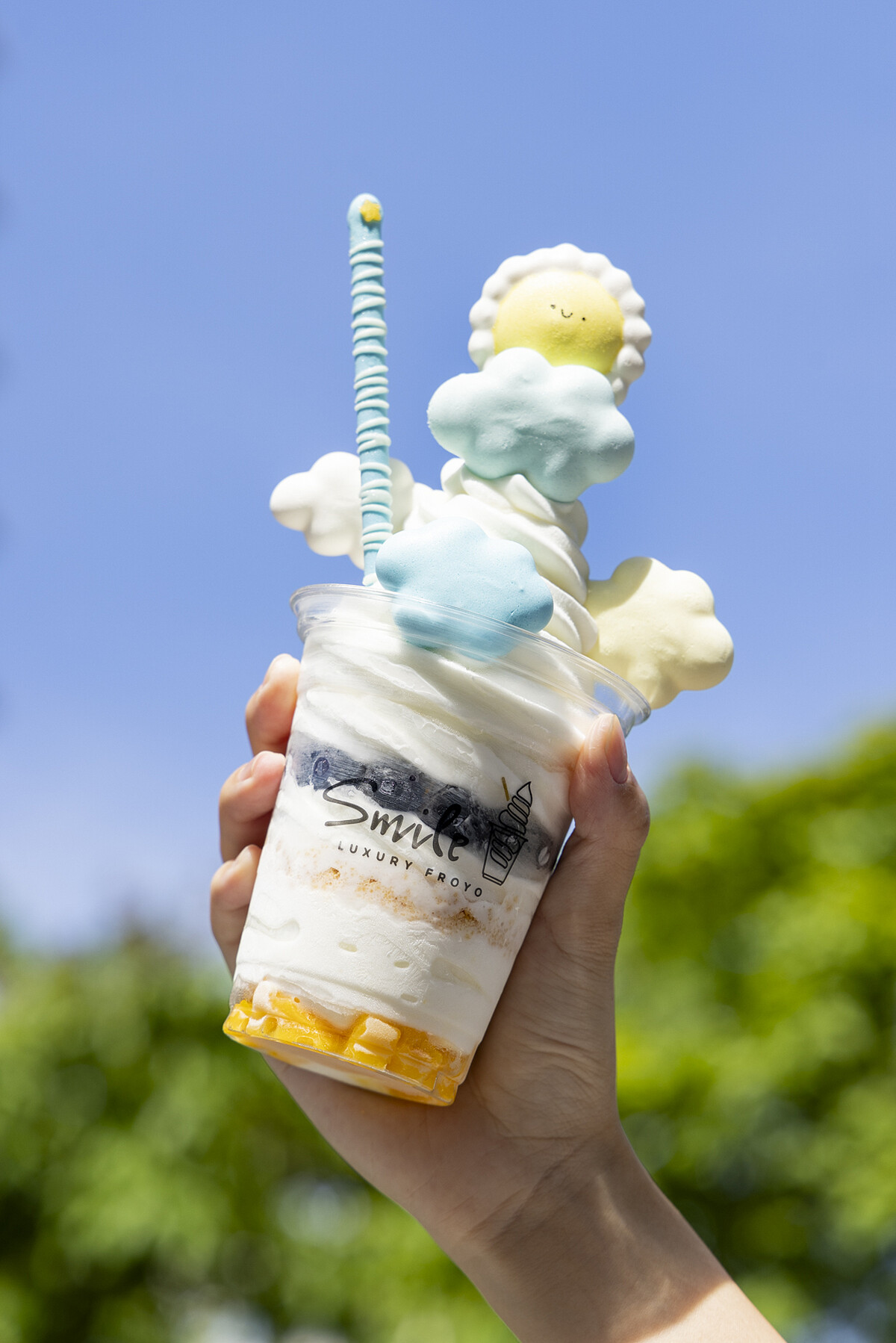 運用優格霜淇淋及雲朵蛋白脆為主要元素,打造軟綿蓬鬆的晴空意象,配上新鮮進口藍莓和新鮮芒果、自製脆粒餅乾,再用星星魔法棒帶來視覺驚喜,讓整杯霜淇淋瞬間充滿童趣!