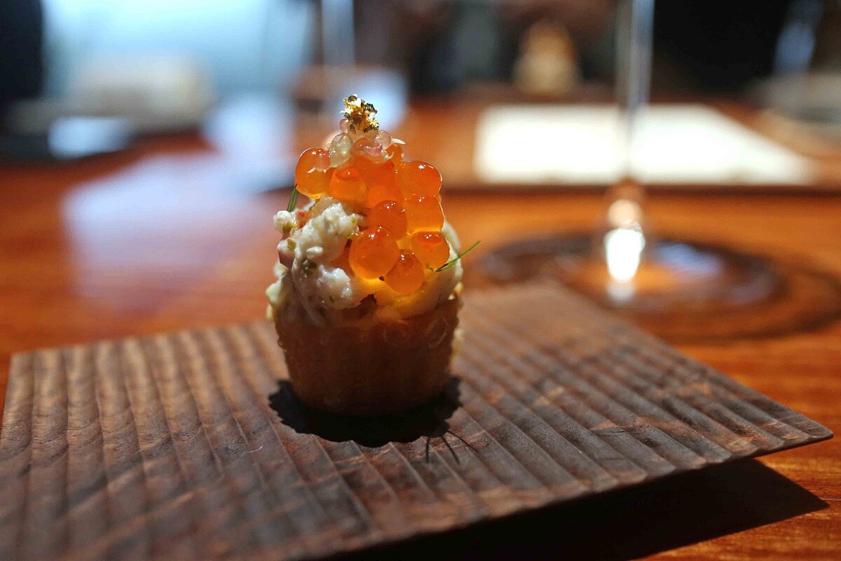 以啤酒麵糊製作的金杯粿,炸成裝載的容器,內餡使用帝王蟹浸泡啤酒,這個方式為瑞典的傳統作法,會以小螯蝦浸泡啤酒,底部鋪以煙燻炭烤茄子結合酸奶、堅果,這是來自中東的傳統做法,最後擺上鮭魚卵與手指檸檬,獨特的酸香讓整體味道更為清爽迷人。