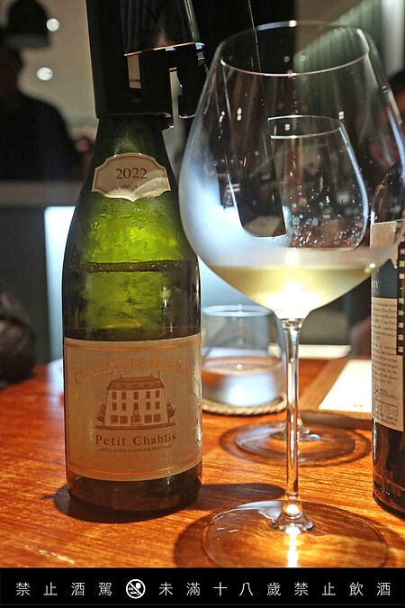 來自法國勃根地地的白酒,由100%的 Chardonnay 葡萄所釀製,屬 Petit Chablis 的一種。酒液呈金黃色,有著青蘋果、柚子與檸檬果香,帶有礦物味與明亮的酸度。與生蠔、酸鹹風味的料理相當搭配。