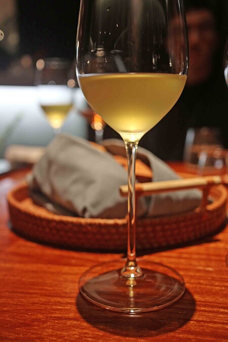 「L'Atelier par Yao」更提供了別出心裁的餐酒服務,入座後侍酒師 Aaron 便會遞上一本像是 KTV 歌單般的酒單,每一頁不同類型的選酒,Aaron 便為它對應了不同歌手的名曲,像是 Adele 的〈I Drink Wine〉就代表了清新明亮的白酒,覺得酒單太複雜了也沒關係,還能告訴 Aaron 自己的喜好讓他為你精心搭配合適的酒款,可選擇3、5、7杯的酒精搭配,或是3、7杯無酒精與有酒精的綜合搭配,完整的無酒精搭配則有4杯。Aaron 的專業為選擇困難的饕客提供了安心又自在的搭配。