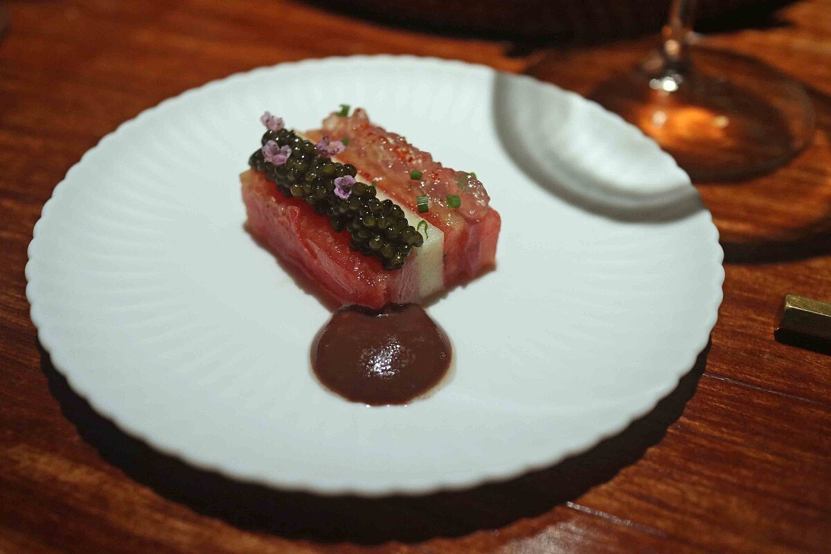 選用東港黑鮪魚中腹,穿插搭配牛番茄與青蘋果,為黑鮪魚帶來不同的口感搭配,並分別在上頭鋪上番茄水果凍與魚子醬,醬汁為可可油醋結合自製發酵的沙棘果,醬汁的香氣增添了整體風味,明亮的酸引出了鮪魚的香氣。